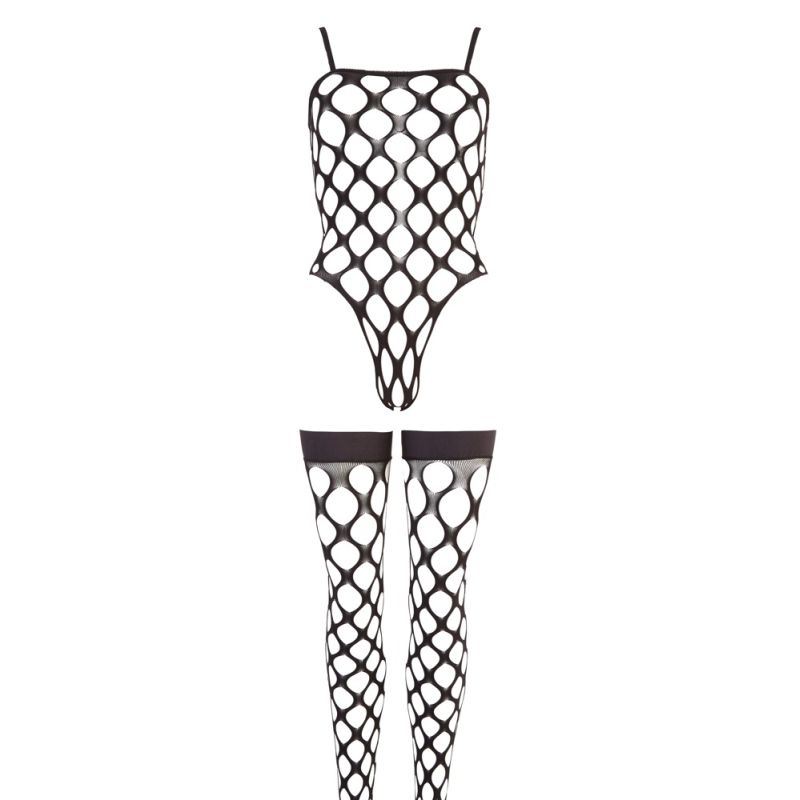 Rio-Body und Strümpfe im Set. Alles aus schwarzem, elastischem, weichem Grobnetz, nahtlos gefertigt. Halterlose Strümpfe mit rutschfester Silikonverstärkung im Abschluss. 90% Polyamid, 10% Elasthan.