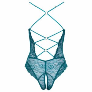 Body ouvert von Cottelli LINGERIE komplett aus feiner weicher petrolfarbener Spitze. Vorne und hinten extra tief und großzügig ausgeschnitten – roségoldfarbene Ringe und Stretchbänder halten alles schön und höchst dekorativ zusammen. Der Schritt ist schon einladend geöffnet. Die Träger sind für optimale Passform verstellbar.