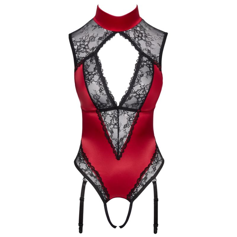 Aufsehenerregender Straps-Body von Cottelli LINGERIE aus edlem rotem Satin mit Einsätzen aus feiner schwarzer Spitze. Rundum weich und elastisch für höchsten Tragekomfort. Raffinierte Schnittführung mit Satin-Halsband zum Knöpfen, schulterbedeckender Spitze und schönem großen Dekolleté-Ausschnitt. Im nahezu freien Rücken mit zwei verstellbaren Hakenverschlüssen. Durch den offenen Schritt führen zwei Stretchriemen. Die Strumpfhalter sind passend verstellbar und auch komplett abnehmbar.