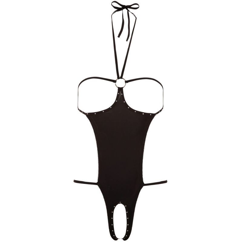 Sexy Einteiler mit Neckholder zum Binden und Strassverzierung an den offenen Cups und dem offenem Schritt. Hinten nur Strings. Schwarz. 85% Polyamid, 15% Elasthan.