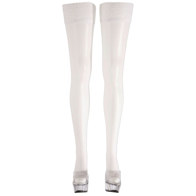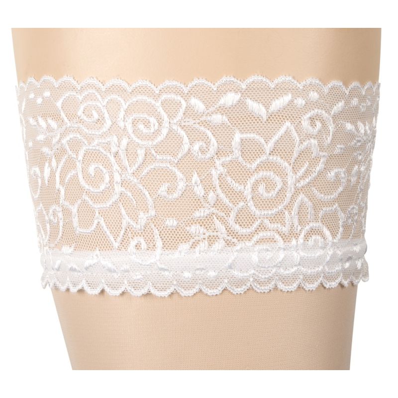 Halterlose Strümpfe mit 7 cm breitem Spitzenabschluss. Traumhaft Weiß für große Auftritte. 17 den. Oekotex-zertifiziert.