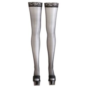 Halterlose Strümpfe mit Ziernaht und Hochferse. Der edle Spitzenabschluss macht den sexy Look perfekt. Mit Silikonband innen für einen rutschfesten Sitz. 20den Oekotex-zertifiziert.