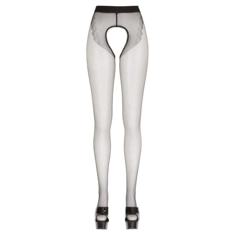 Seidige Straps-Strumpfhose mit eingewebtem Tanga-Muster und komplett offenem Schritt. 20 den. Oekotex-zertifiziert.