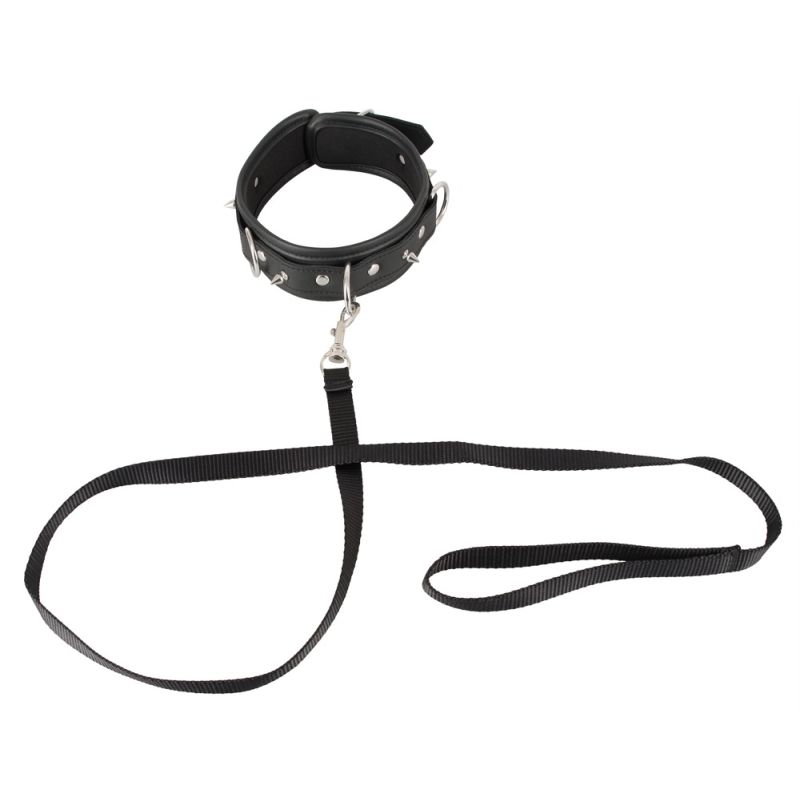Die Halsfessel in Leder-Optik ist weich gepolstert und besticht mit dekorativen Spikes und D-Ringen. Die Webriemen-Leine ist abnehmbar. Vegan.